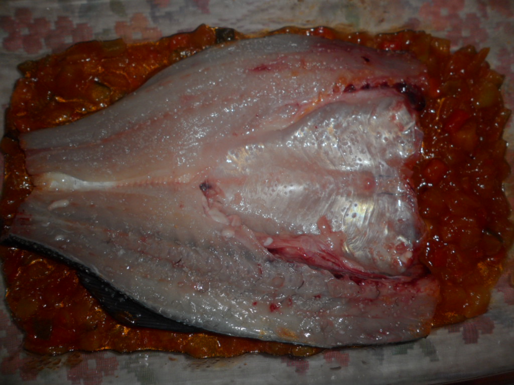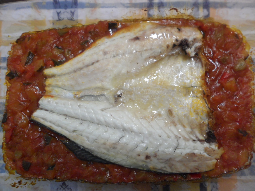 En una fuente de horno extendemos la fritada ó pisto, ponemos la lubina encima, abierta y con la piel para abajo, le ponemos sal.
