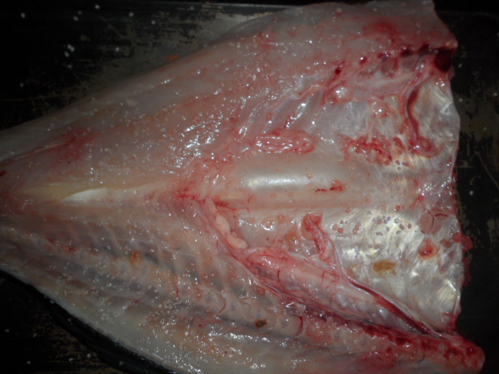 Le pedimos al pescadero que nos limpien las lubinas, les quiten las cabezas y las abran por la mitad.