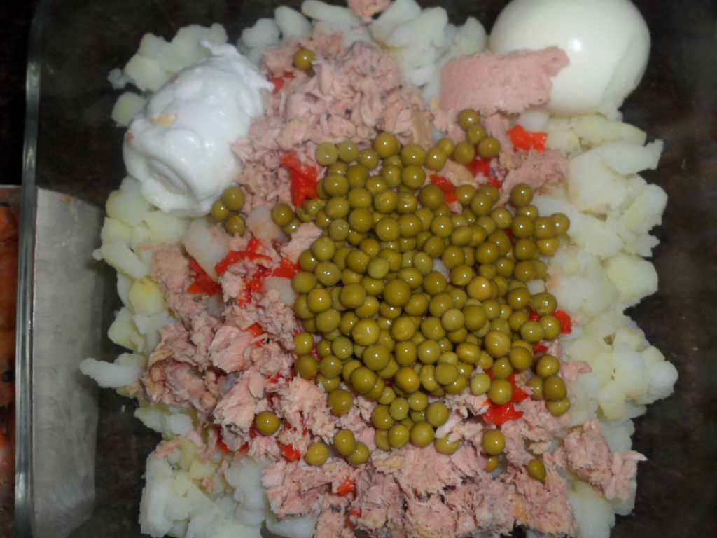 Cuando las patatas estén frías las ponemos en una fuente ó ensaladera y les vamos agregando los ingredientes (guisantes, los pimientos morrones picados, 1 huevo duro troceado, (el otro se deja para adornar) el atún al natural, si hemos puesto langostinos también los podemos añadir), lo removemos todo y lo probamos de sal y si hace falta se rectifica.