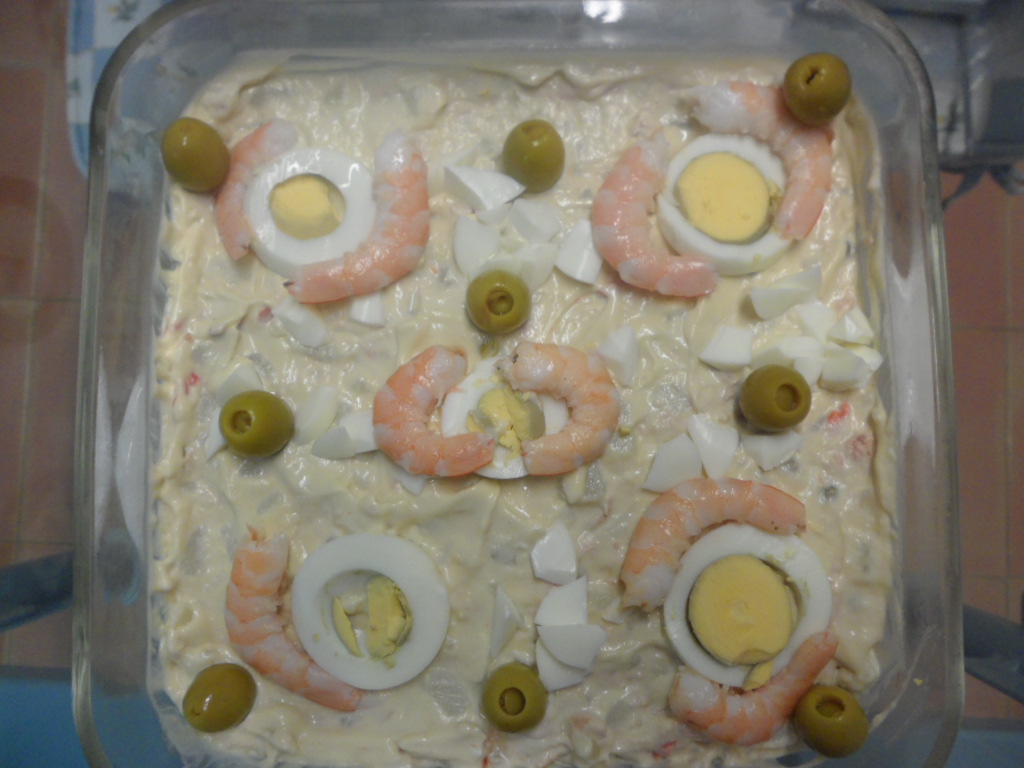Mezclamos la mayonesa con el resto de los ingredientes, que quede igual por todas partes y se adorna al gusto, yo, en esta ocasión, lo he hecho con langostinos,huevo duro y unas aceitunas.