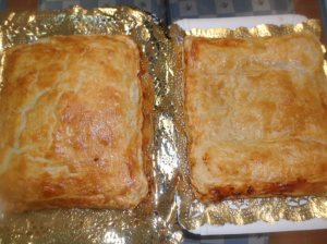 Una empanada casera de atún con tomate y otra de morcilla de cebolla y pera (hechas por mi)