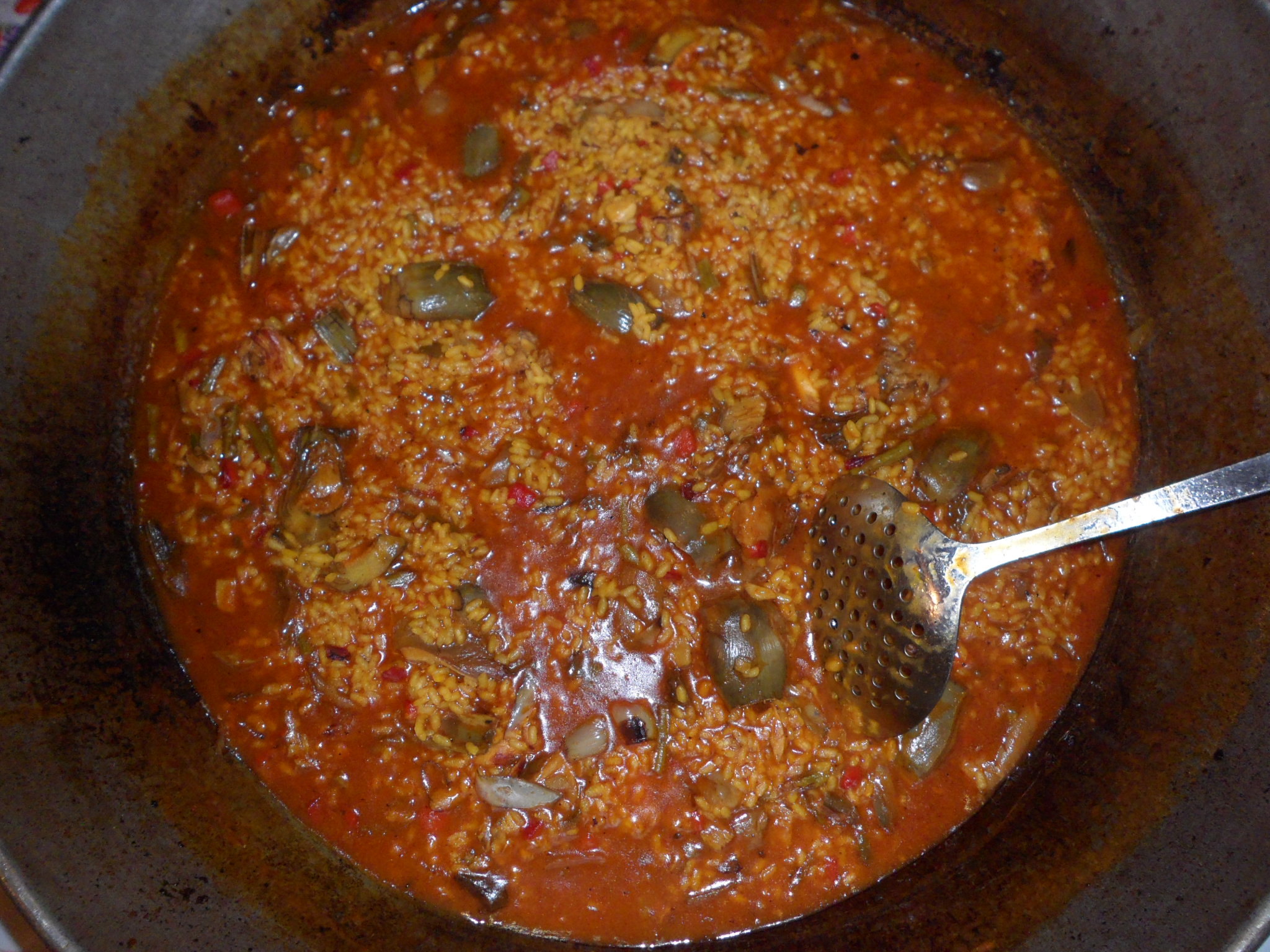 El de hoy ha sido con pollo y toda clase de verduras, alcachofas, habas, espárragos setas y ha salido riquísimo, el perol casi no ha habido que fregarlo, el arroz se come como a las 5 de la tarde, aunque parezca mentira por la hora y a pesar de todo lo que hemos comido anteriormente, como digo no ha quedado ni un grano.