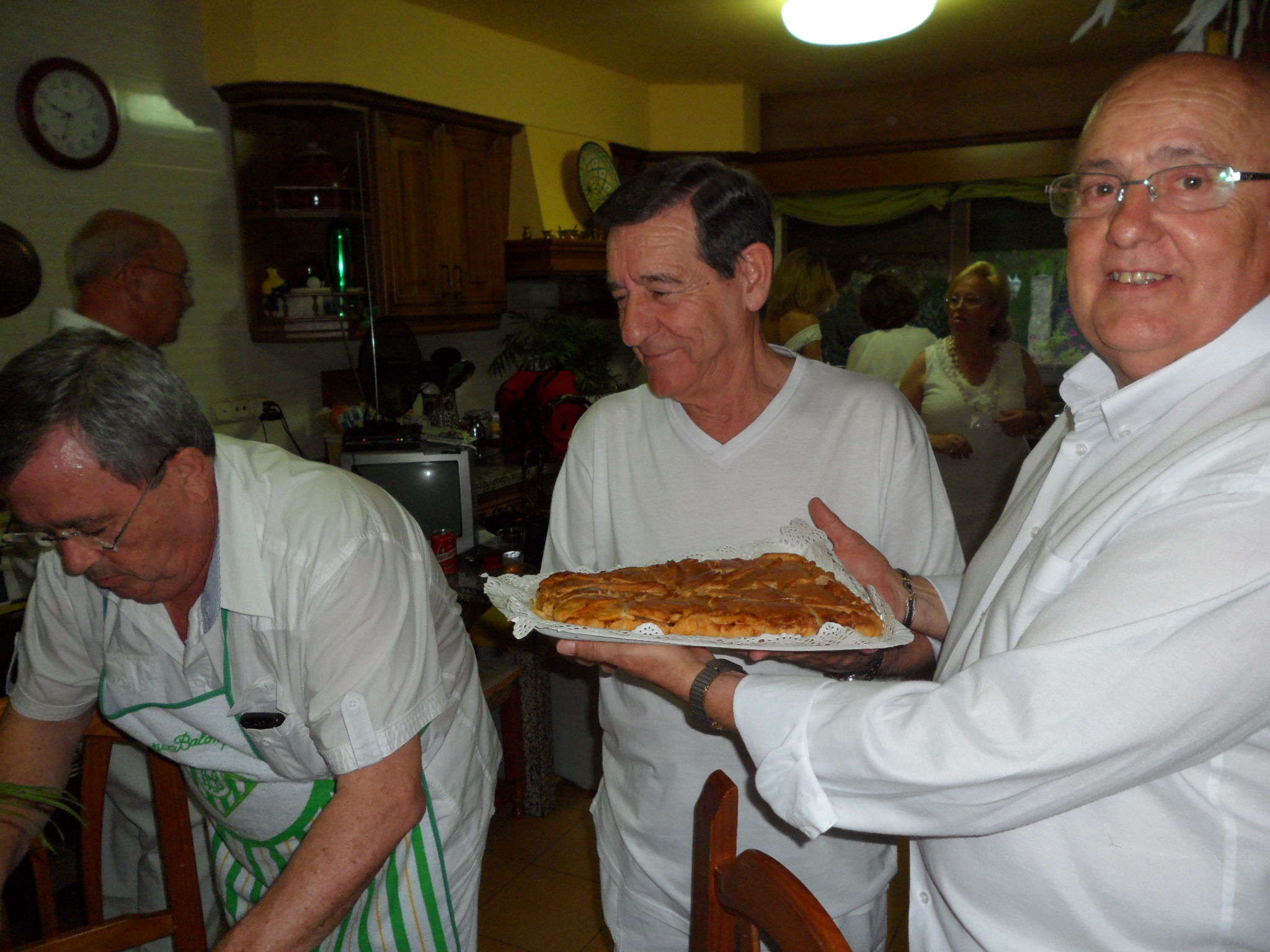 Ambiente en la cocina, algunos de nosotros hemos llevado un plato, todos no, porque sería demasiada comida, se ha hecho una cuenta general de los gastos y hemos entrado todos, así no hay problemas.Las bebida también han sido entre todos.La empanada que lleva Rafael Castro la hizo Rafi, la esposa de Marcelo, auténtica empanada gallega.