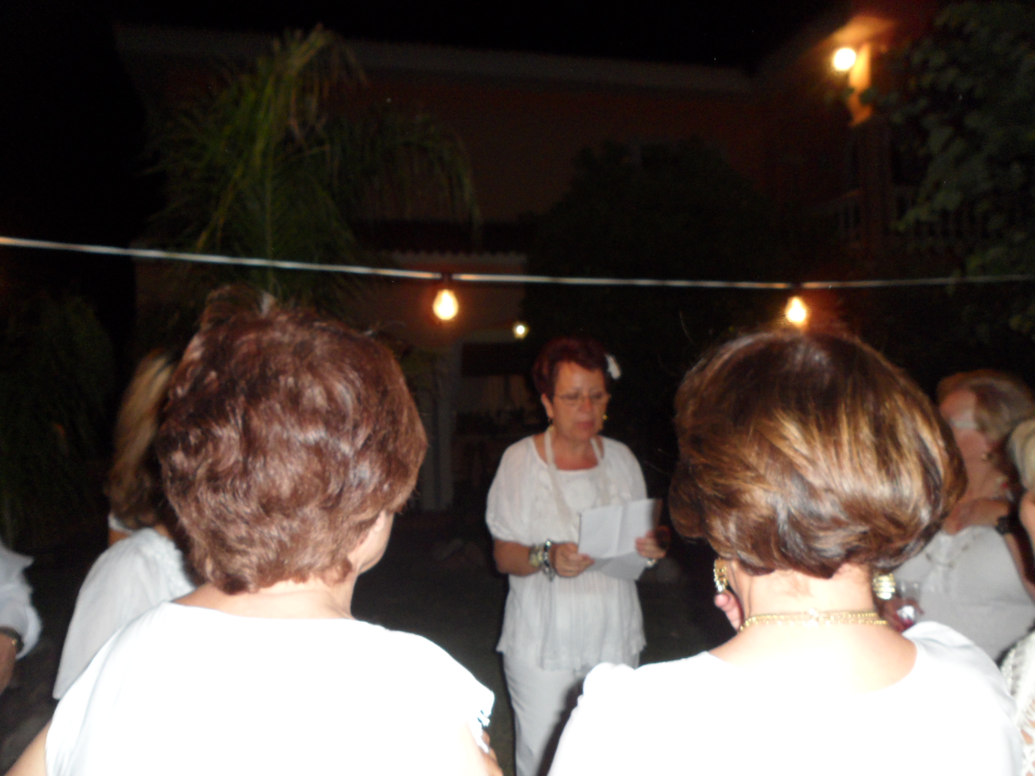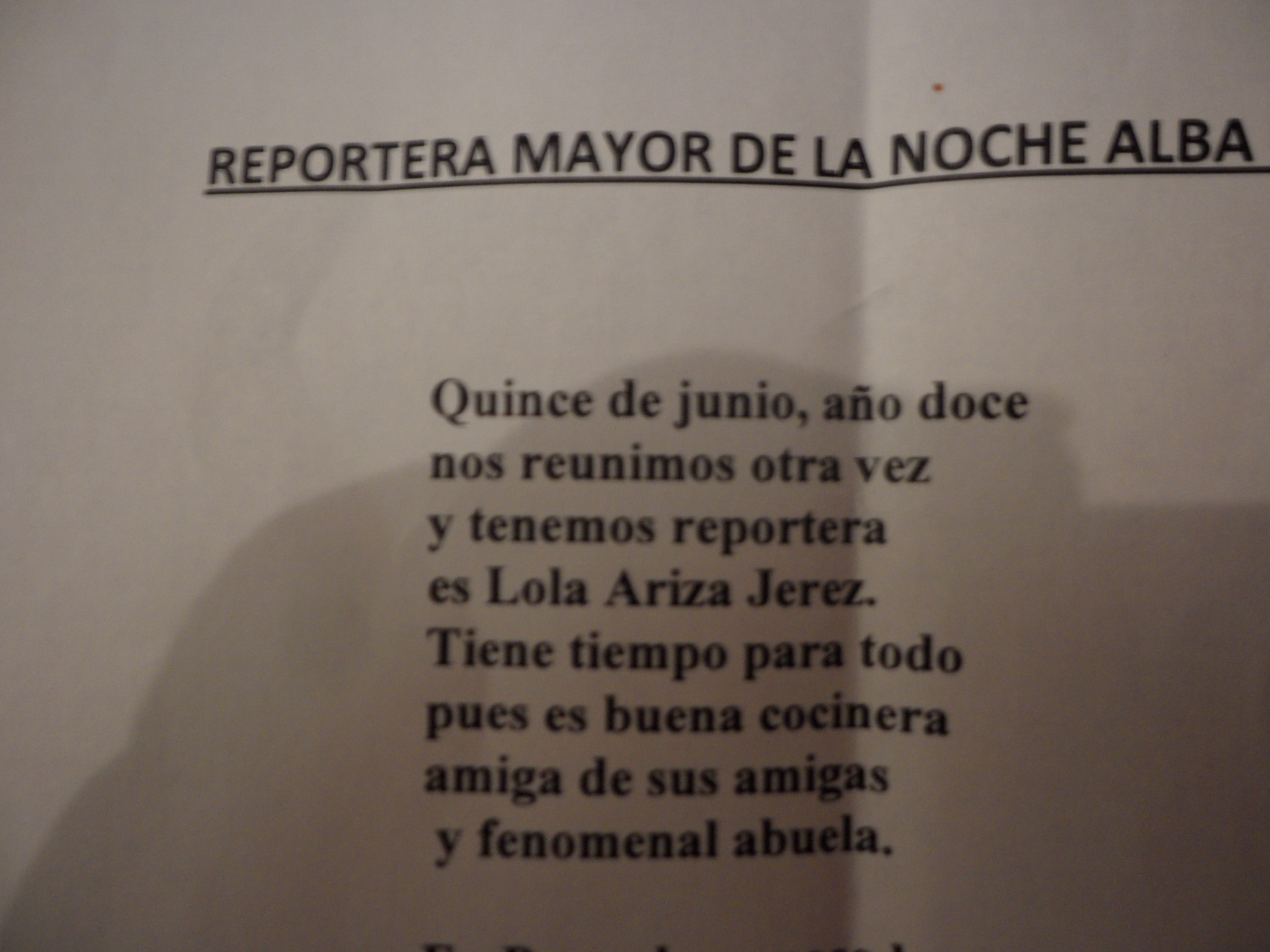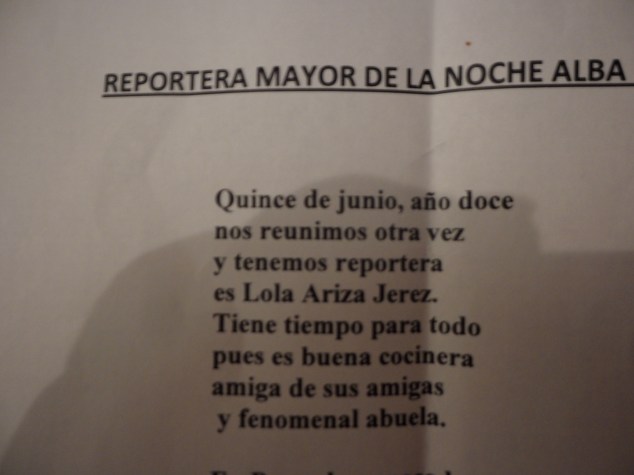 De pronto aparecen todas las amigas viniendo hacia mí, al son de Lolita!! tú tienes una forma de bailar!! etc. del Duo Dinámico, me quedo de una pieza, vienen con una capa negra, me la ponen, me imponen una insignia con el escudo de Córdoba en plata, precioso, y me nombran Reportera Mayor de la Noche Alba Cordobesa (así reza el título que me concedieron)