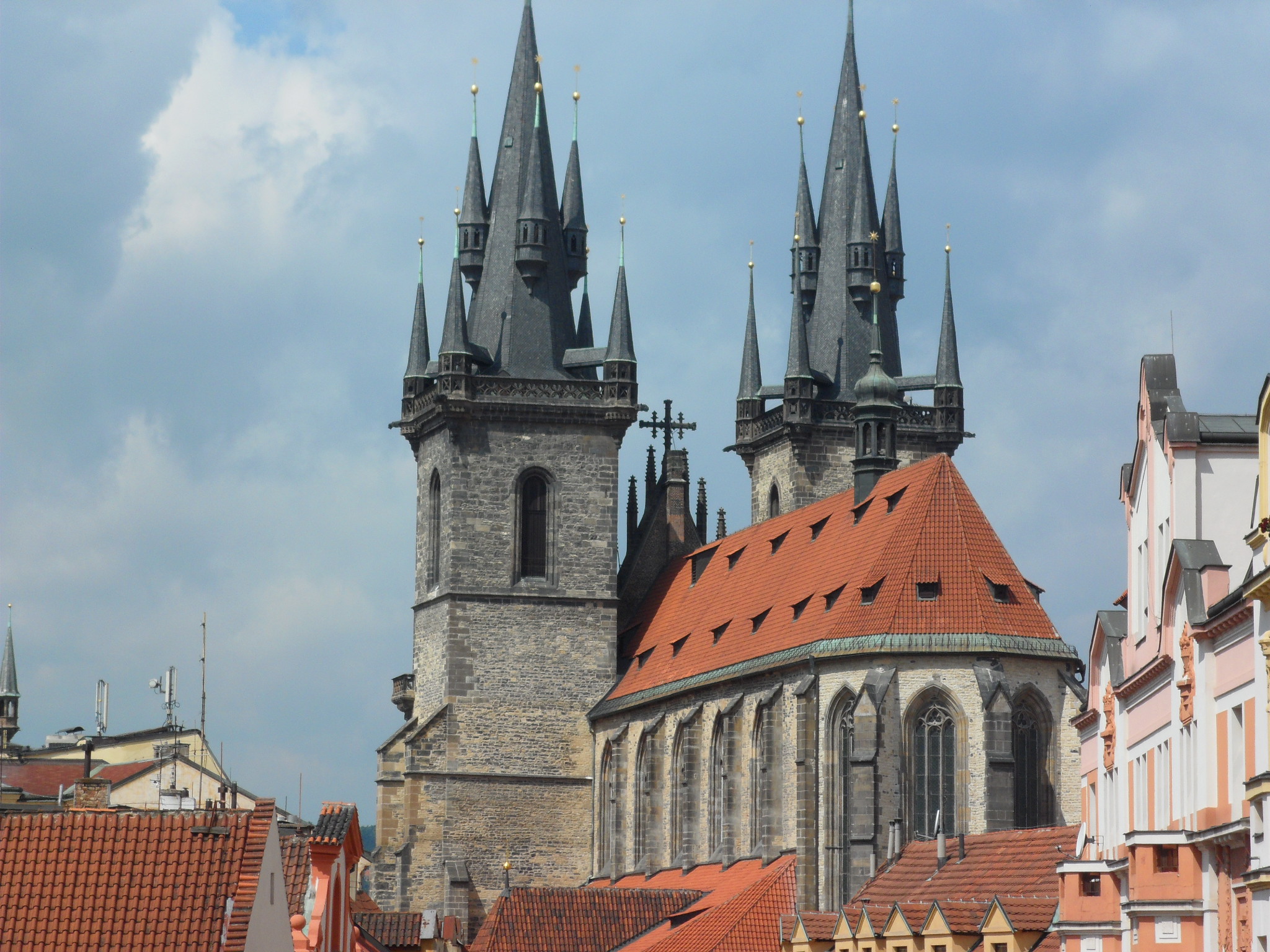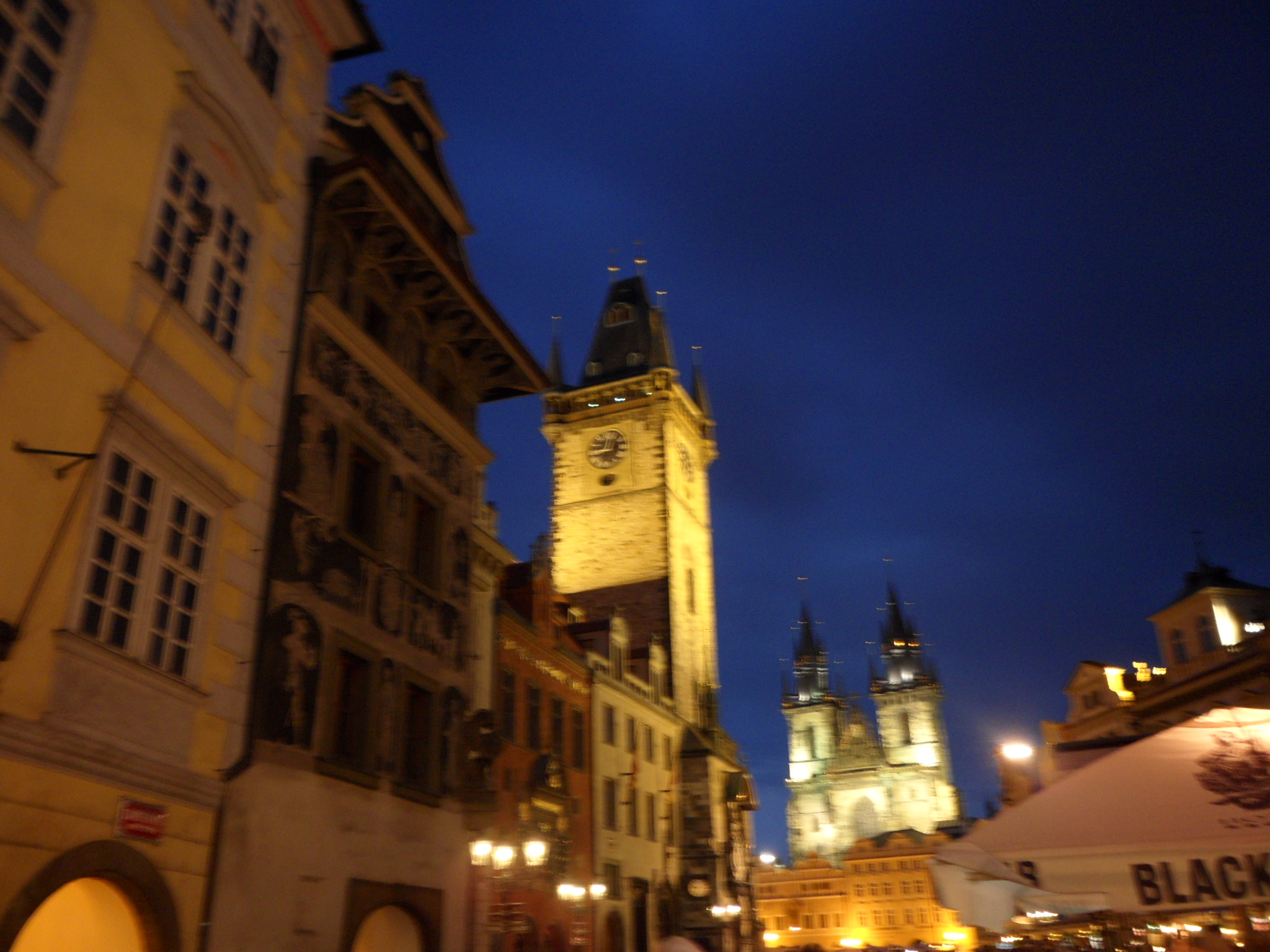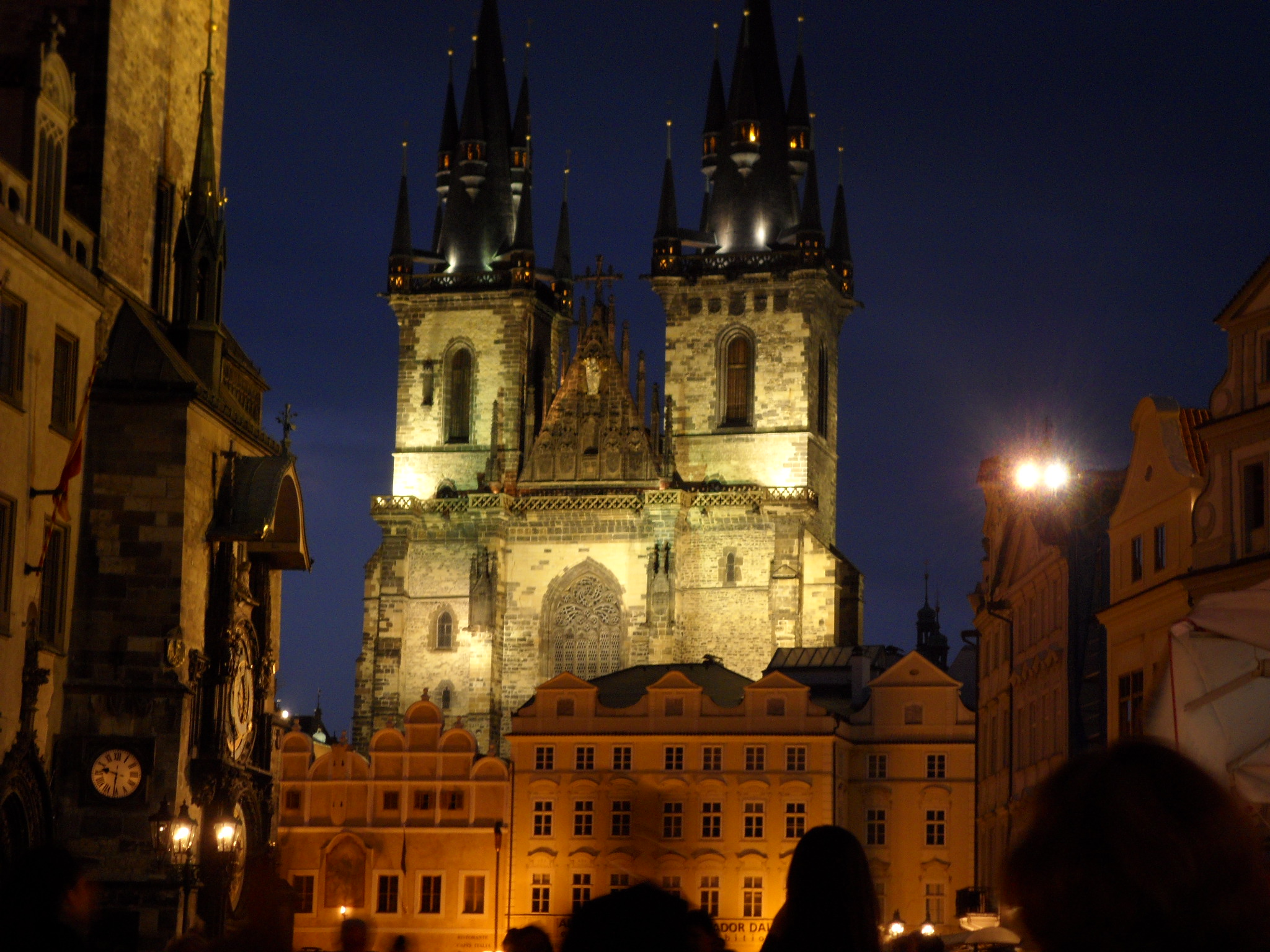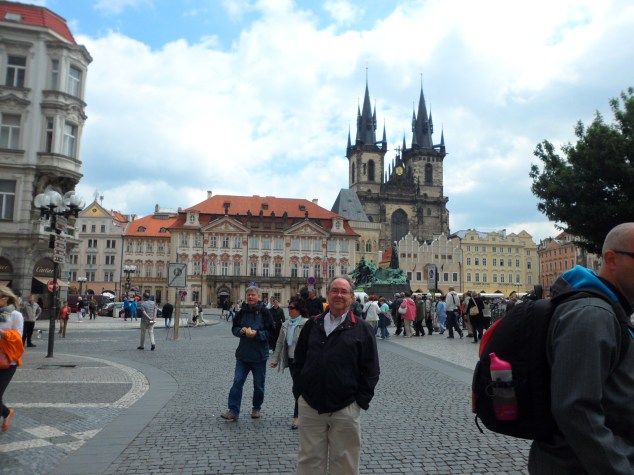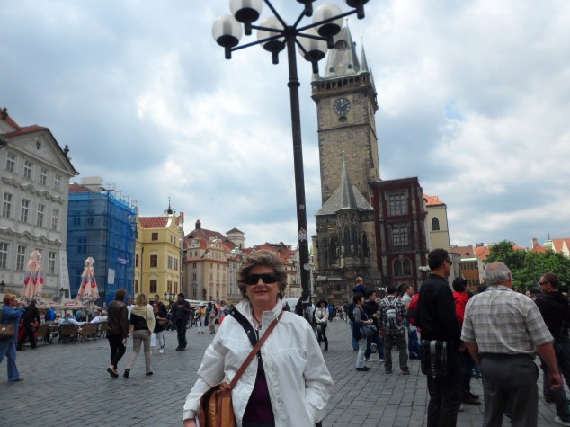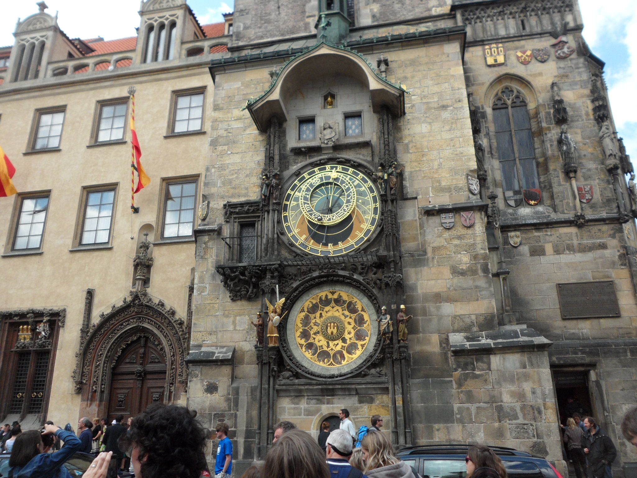 el famoso Reloj Astronómico, alrededor de él siempre hay muchísimas personas cuando da las horas y desde lo alto de la torre un heraldo toca una trompeta con una música característica y saludan con una bandera