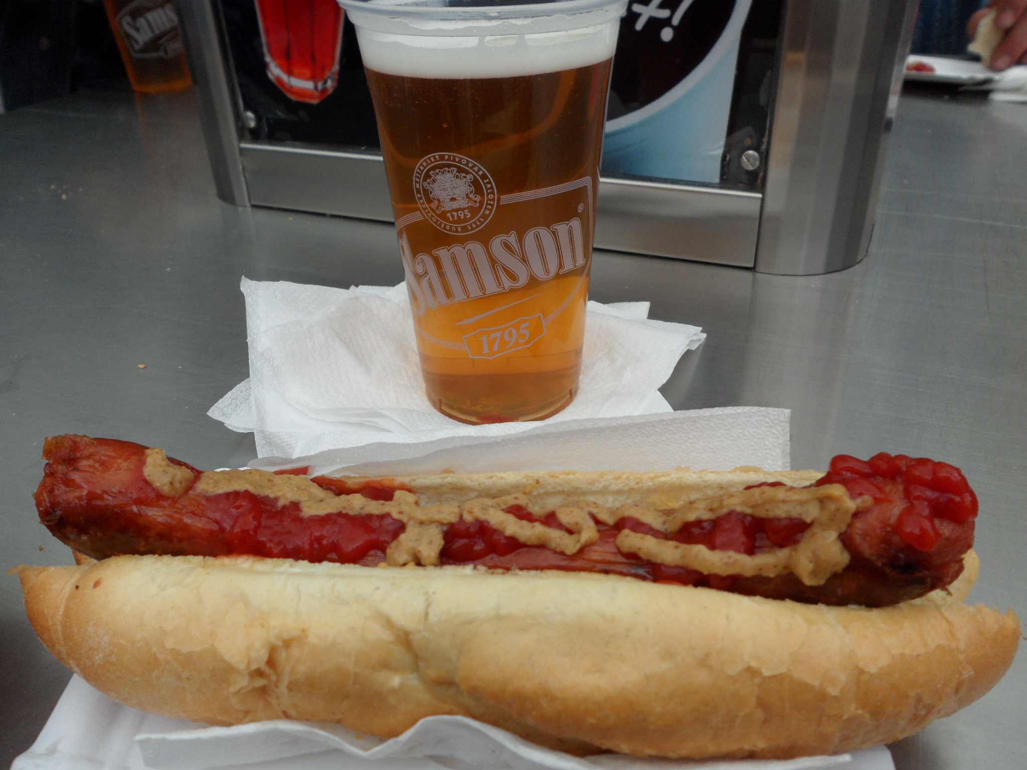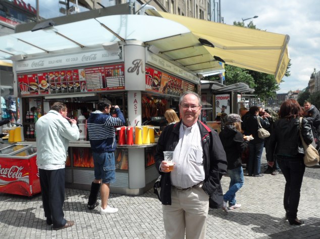 Para reponer fuerzas de nuestro paseo nos fuimos a la Plaza de Wenceslao y allí en un puesto típico de salchichas, degustamos un par de ellas con una buena cerveza checa, por cierto todo baratísimo, fíjaros que aspecto las salchichas, estaban riquísimas!!