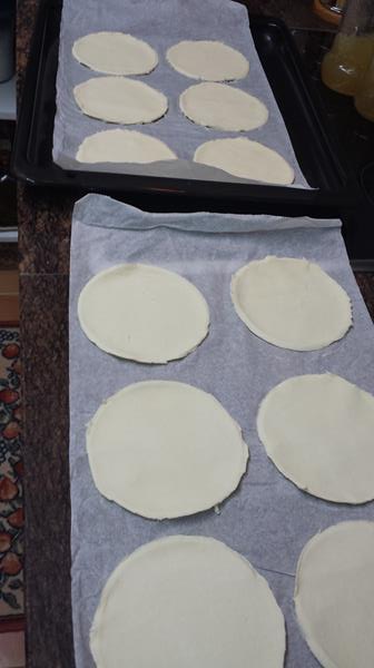 Como está fresco no hay que esperar que se descongele ni nada, ponemos el papel de horno que trae, en la fuente del horno y encima extendemos la masa. Como los Manoletes tienen que ser redondos, yo me he servido de un plato pequeño de unos 10 cm. para conseguir la forma redondeada.