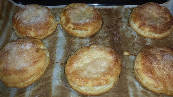 Los saqué del horno, los pinté con huevo batido y los espolvoreé de azúcar, y de nuevo al horno durante 5 minutos más que el azúcar se adhiera bien.