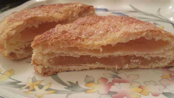 En una de las piezas del hojaldre, la que ha servido de base, he puesto unos 50 grs. de cabello de ángel, sin llegar a los extremos.