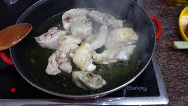 Removemos y seguimos sofriendo, cuando se ha consumido el jugo natural, le añadimos las verduras troceadas, las alcachofas las habremos limpiado previamente de las hojas duras sobrantes.