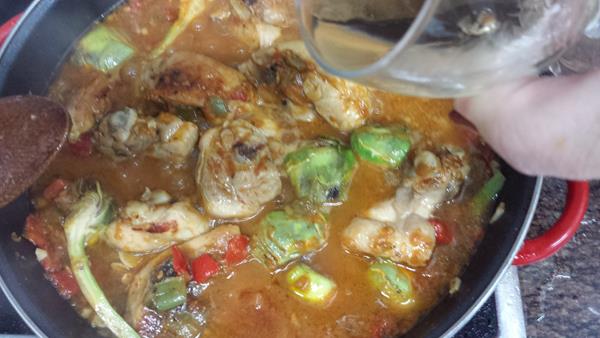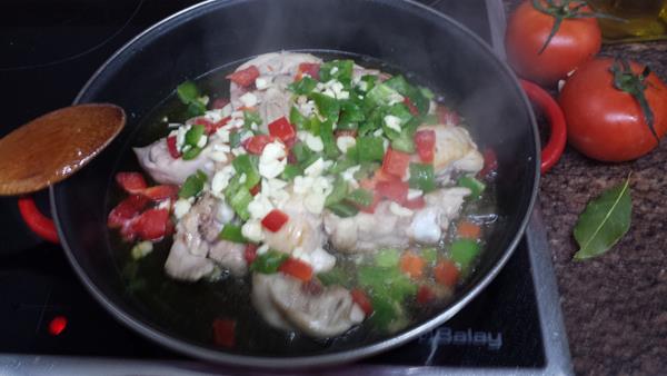 Cuando veamos que se ha evaporado el vino, le añadimos agua para cubrir las verduras y en 10 ó 15 minutos estarán tiernas.