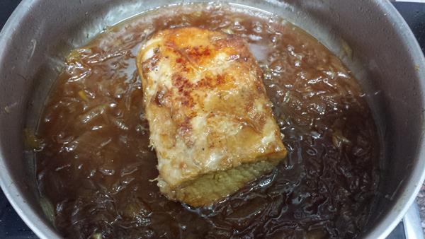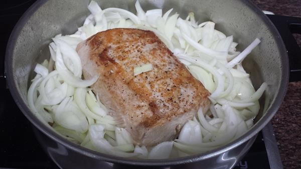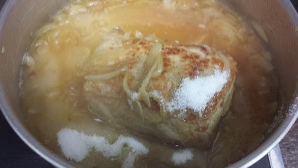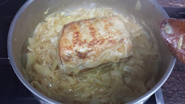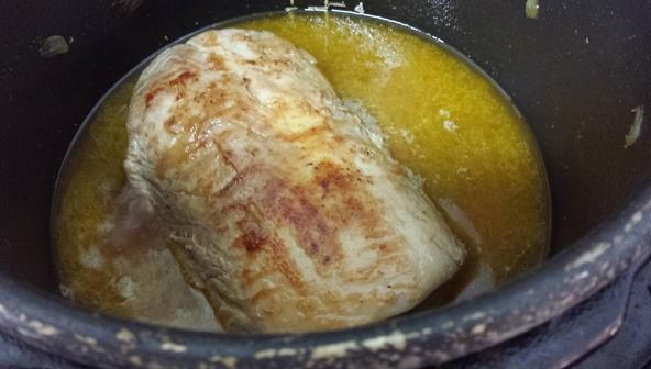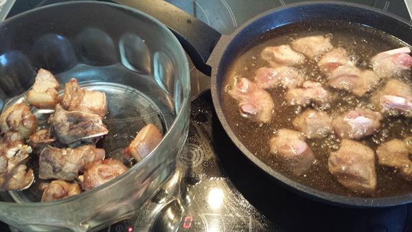 Cuando se evapore el vino, lo cubrimos de agua y lo dejamos que hierva hasta que esté tierno y se quede en la salsa.