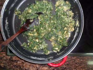 Y vemos que poco a poco se va espesando hasta llegar a despegarse la masa de la sartén.