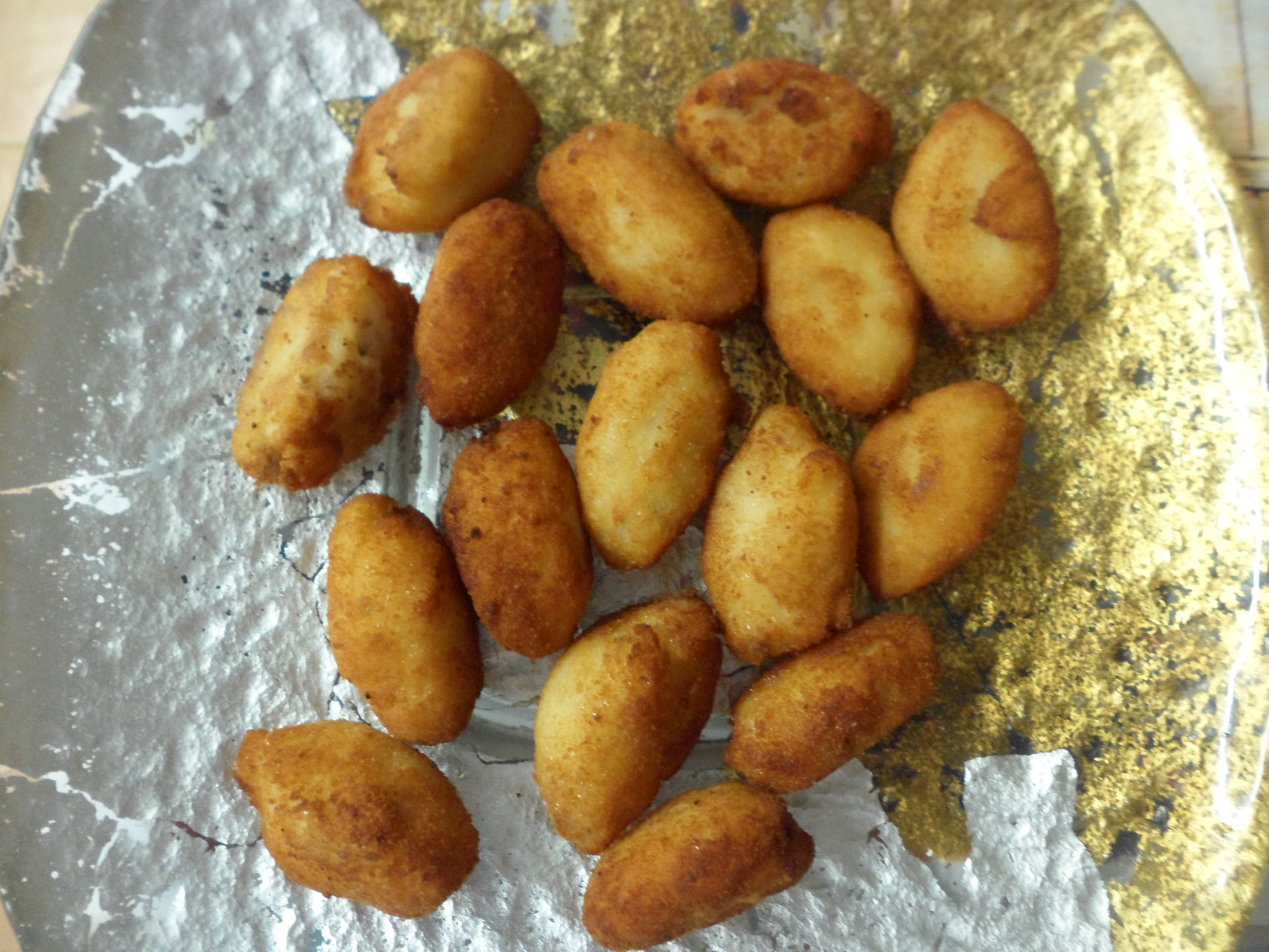 Pasadas unas horas, después de pasar algunas en el frigorífico, procedemos a formar las croquetas, yo lo hago con dos cucharas, las paso por pan rallado, luego por huevo batido y finalmente por pan rallado de nuevo. Tengo que reconocer que encontré la masa un poco dura, pero como bien dice Ana en su receta, eso es porque están hechas con mantequilla, pero que luego después de freirlas, se deshacen en la boca y así ha sido.