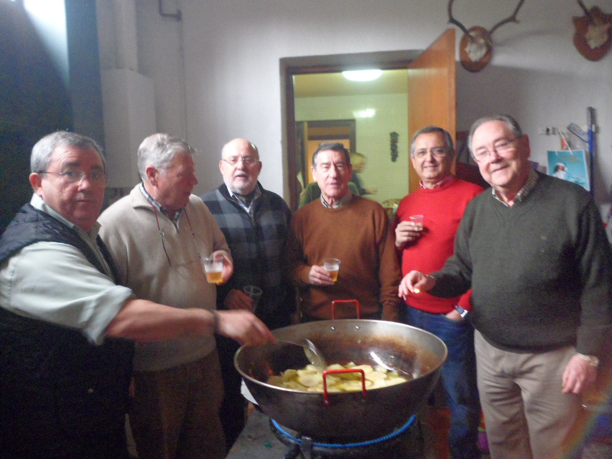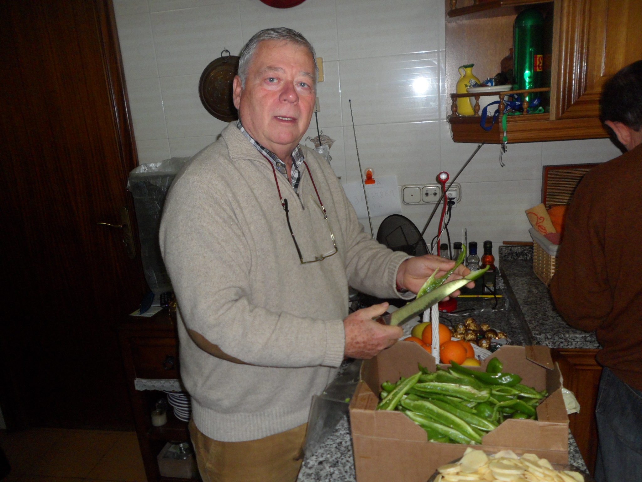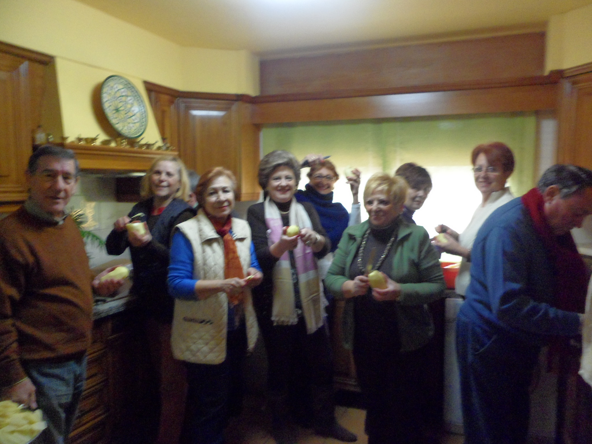 Este plato lo hemos compartido en casa de Lola y Candy en la última reunión que hemos celebrado allí. Como éramos más de veinte, había que colaborar en pelar patatas, partir pimientos etc. etc., este era el ambiente en la cocina, todos pelando patatas.