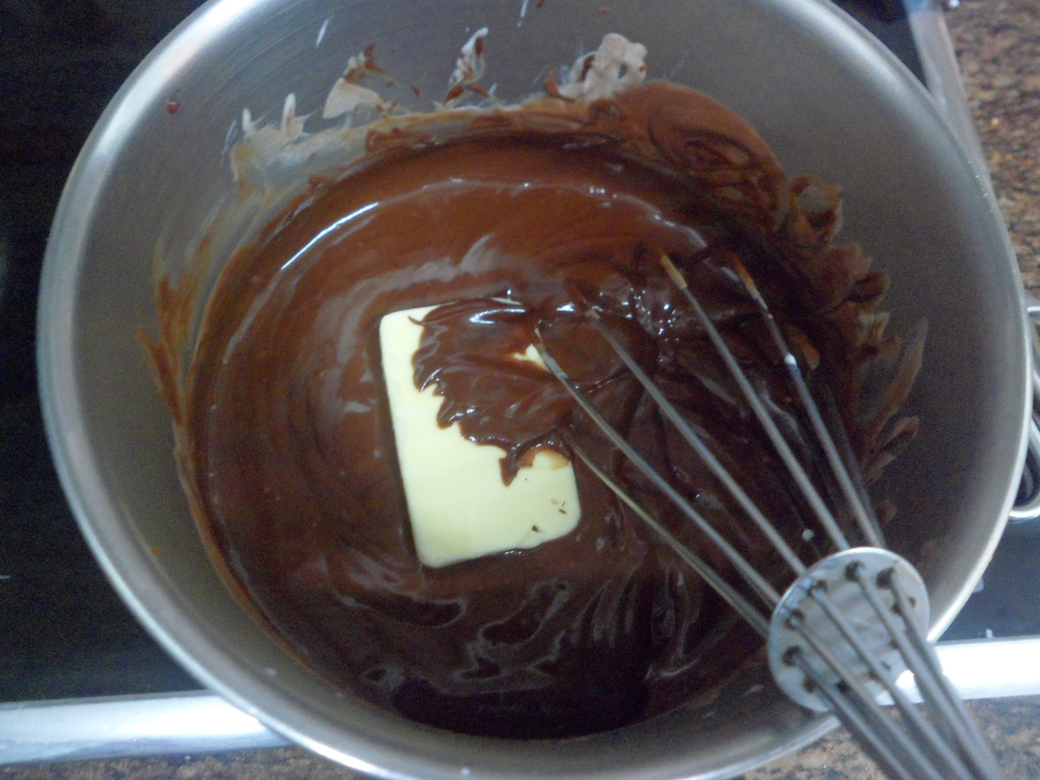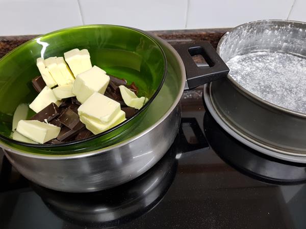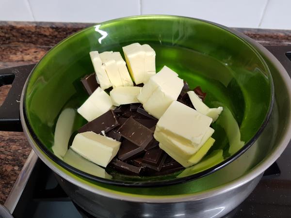 Ponemos el chocolate troceado y la mantequilla en un bol apto para meterlo en agua hirviendo y los derretiremos al baño María