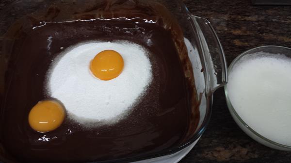Cuando el chocolate y la mantequilla estén derretidos, retiramos el bol del baño María, y los vamos incorporando, sin dejar de remover, a la mezcla de huevos y azúcar.