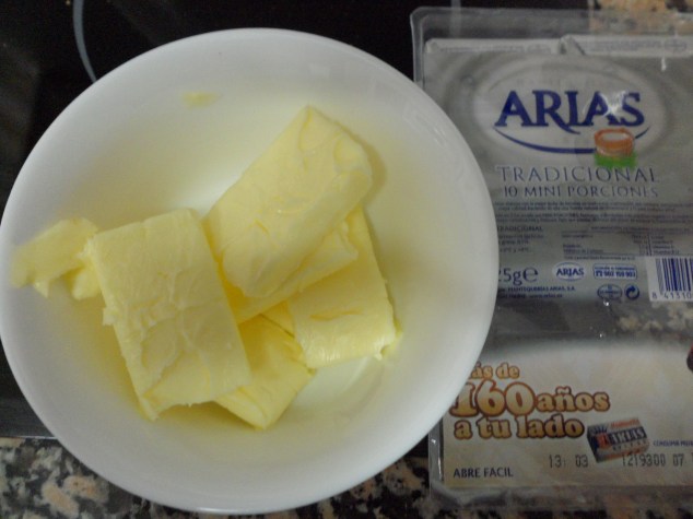 Ponemos la mantequilla en un bol y metemos en el microondas unos 30 segundos para que se derrita, a continuación ponemos las barritas de chocolate en el mismo bol y lo volvemos a introducir en el microondas durante 1 minuto aproximadamente.