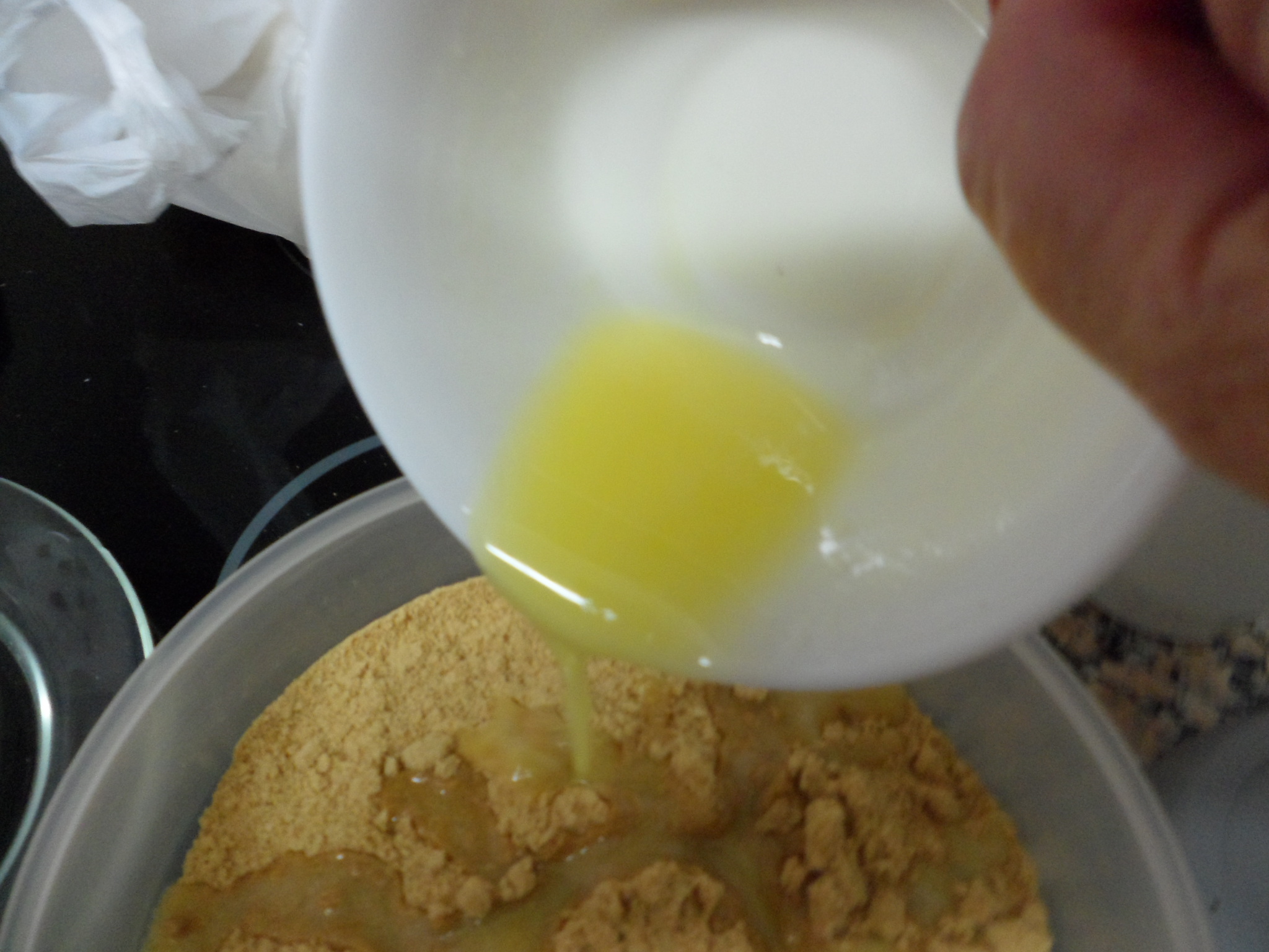 Ponemos el chocolate y la mantequilla derretidos en el bol de los huevos y el azúcar, mezclamos.