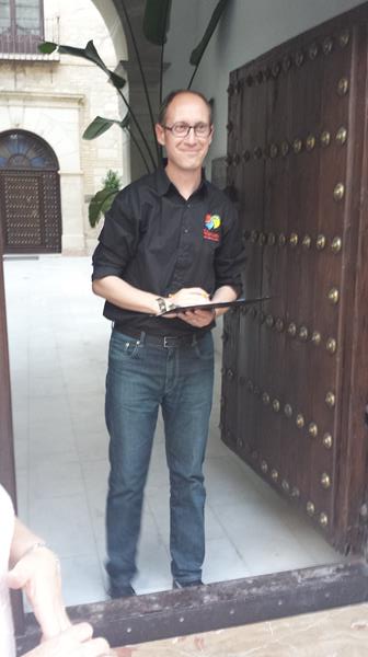 A las 9 en punto de la tarde, nos recibió en la Puerta de Palacio un representante del Conde para invitarnos a una Cena que se celebraba allí, ya, la manera en la que fuimos nombrados se adivinaba un halo de misterio, aquí tenemos a José Antonio García de Tu Historia invitándonos a entrar.