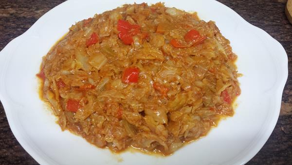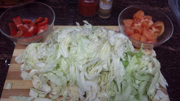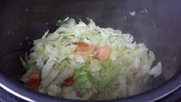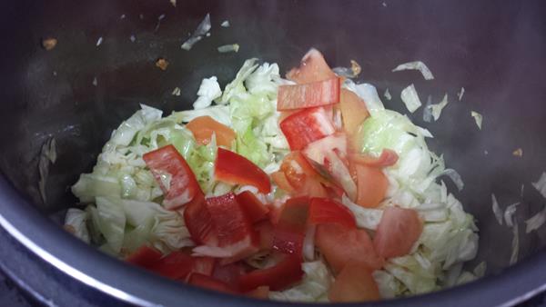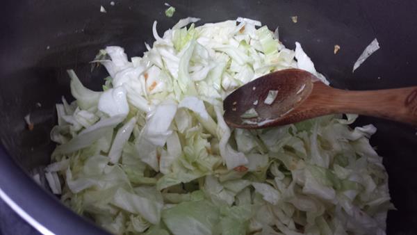 Yo lo he preparado en mi olla rápida programable y llegado a este punto, la he tapado y he puesto 3 minutos, suficientes para que se haga la verdura, si se hace en otro tipo de recipiente habrá que esperar que la col se ponga tierna el tiempo necesario.