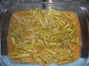 En el aceite de freir los ajos y el pan ponemos los espárragos, los rehogamos y a continuación le añadimos la mezcla del mortero, lo mezclamos todo y cuando empiece a hervir, les ponemos los cominos molidos, el pimentón y el vinagre y se rectifica de sal, se deja hervir hasta que se vean los espárragos tiernos del todo y quede una salsa trabada.