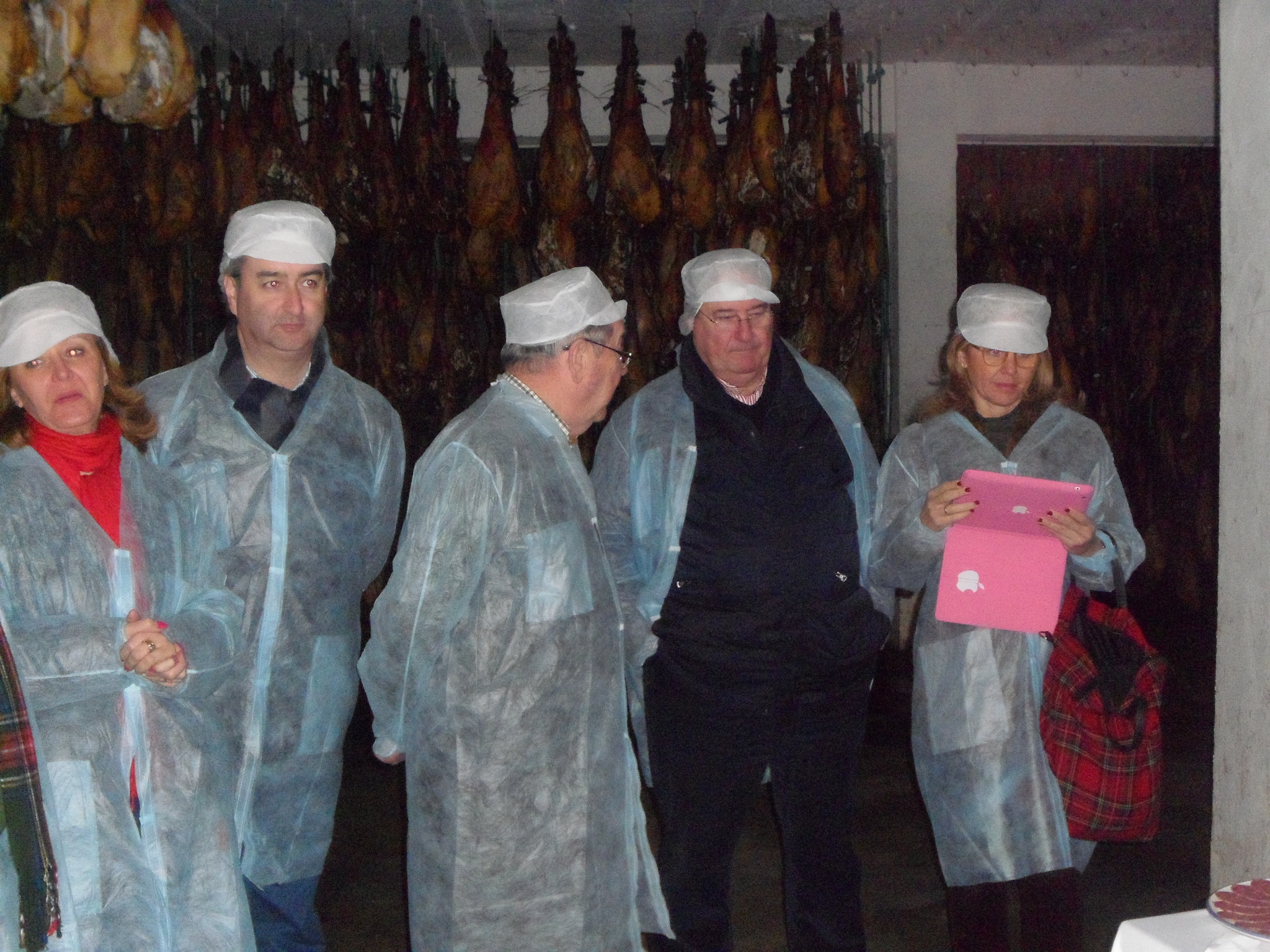 A continuación nos dirijimos a la fábrica de jamones Belloterra, allí nos recibe nuestro también cofrade Javier Castro, presidente de la entidad, nos enseña las instalaciones y nos explica todo el proceso para obtener los mejores jamones del mundo de cerdo ibérico puro y de bellota.
