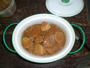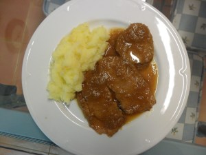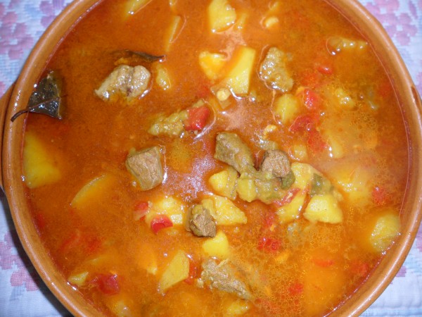 Cuando la carne esté tierna, se destapa la olla y se tienen preparadas las patatas partidas a cascos, se incorporan a la olla, rectificando si es necesario la cantidad de agua y la sal.