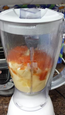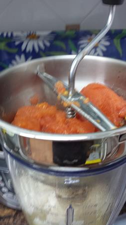 Sacamos y la ponemos en el vaso de la batidora junto con parte de las almendras, dejaremos algunas enteras para adornar, le añadimos el vino y lo trituramos todo junto.