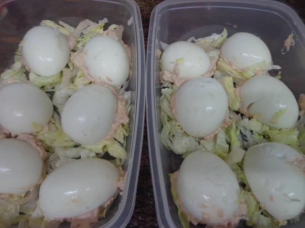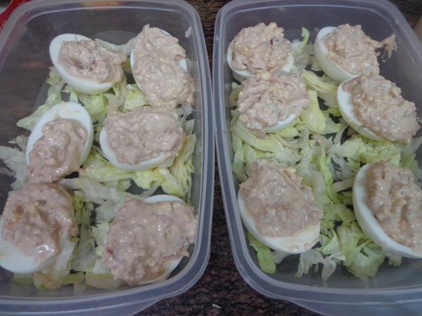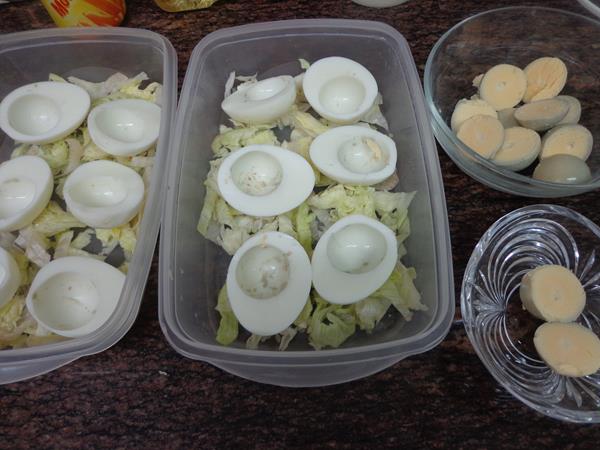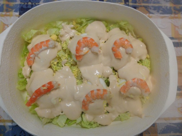 Y a continuación ponemos una buena capa también de la mezcla de ensalada, huevo duro etc.