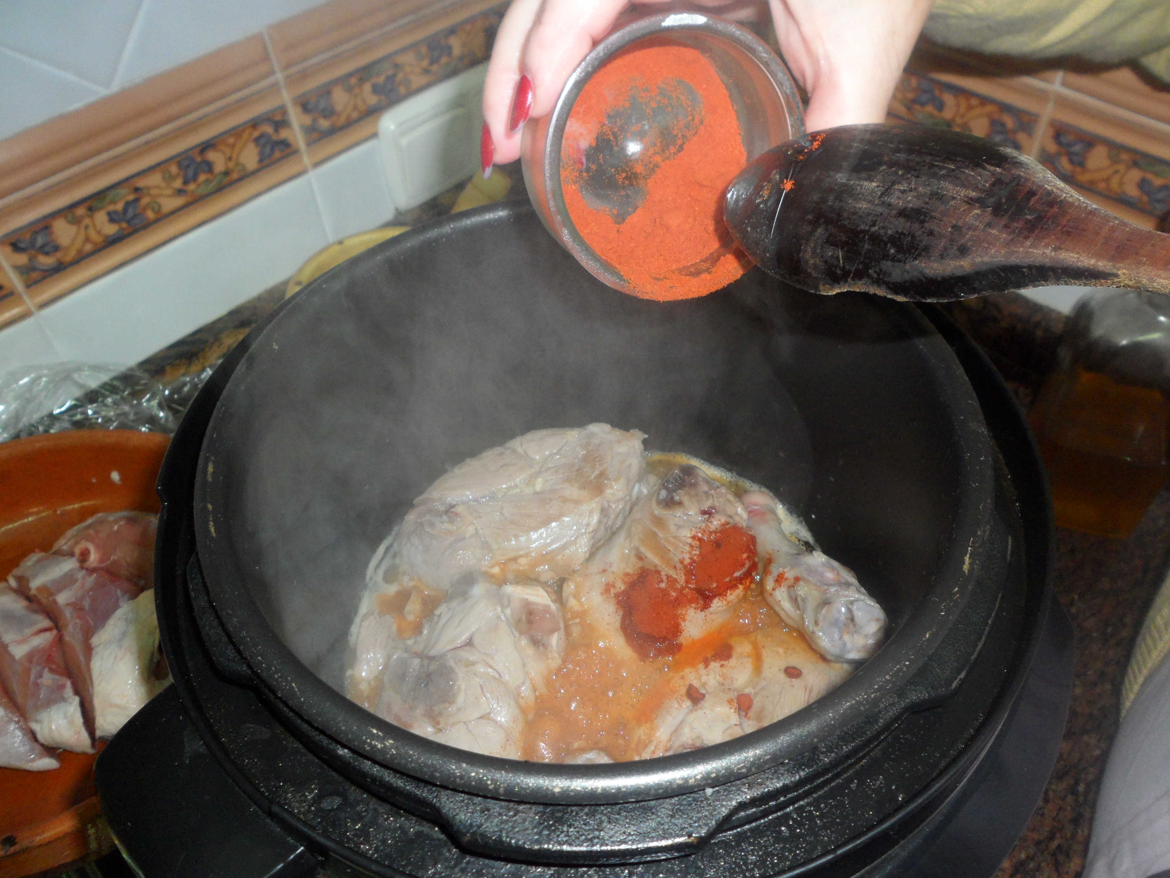 Cuando el sofrito anterior se ve un poco hecho, añadimos las patatas y las removemos muy bien, le añadimos el pimentón y la sal a nuestro gusto.
