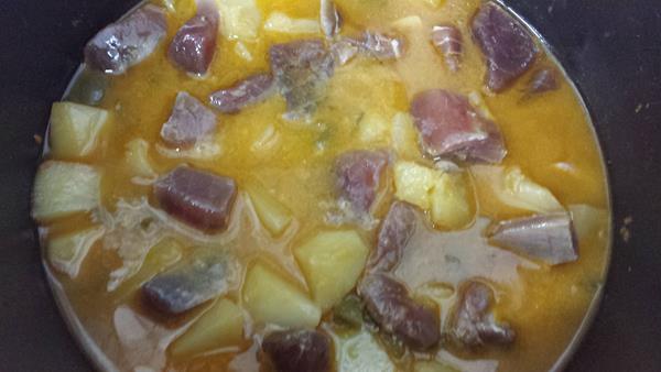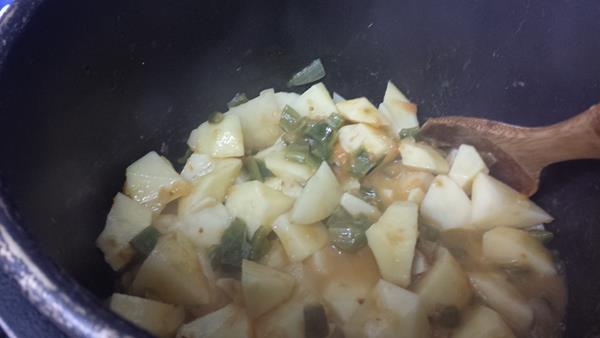 Le añadimos un poco de agua, la suficiente para que las patatas se cuezan y enternezcan, y cuando están en ese punto, le añadimos los trozos de atún, que den solamente un hervor, que no estén crudos pero que no se hagan demasiado.