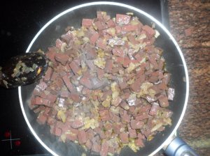 La removemos bien y le damos golpecitos con la cuchara de palo para que se suelten los trozos, y ahí le añadimos el cubito de concentrado de carne desmenuzado, le da muy buen sabor.